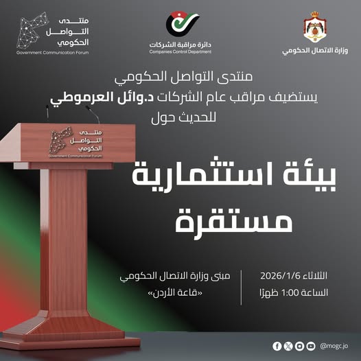 يعقد أمين عام وزارة الاتصال الحكومي الدكتور زيد النوايسة ومراقب عام الشركات الدكتور وائل العرموطي لقاء مع ممثلي وسائل الإعلام بعنوان (بيئة استثمارية مستقرة) وذلك عند الساعة الواحدة من ظهر يوم غد الثلاثاء في مقر وزارة الاتصال الحكومي.