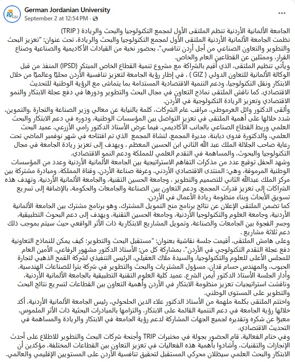 نيابة عن معالي وزير الصناعة والتجارة والتموين عطوفة مراقب عام الشركات يرعى الملتقى الأول لمجمع التكنولوجيا والبحث والريادة في الجامعة الألمانية