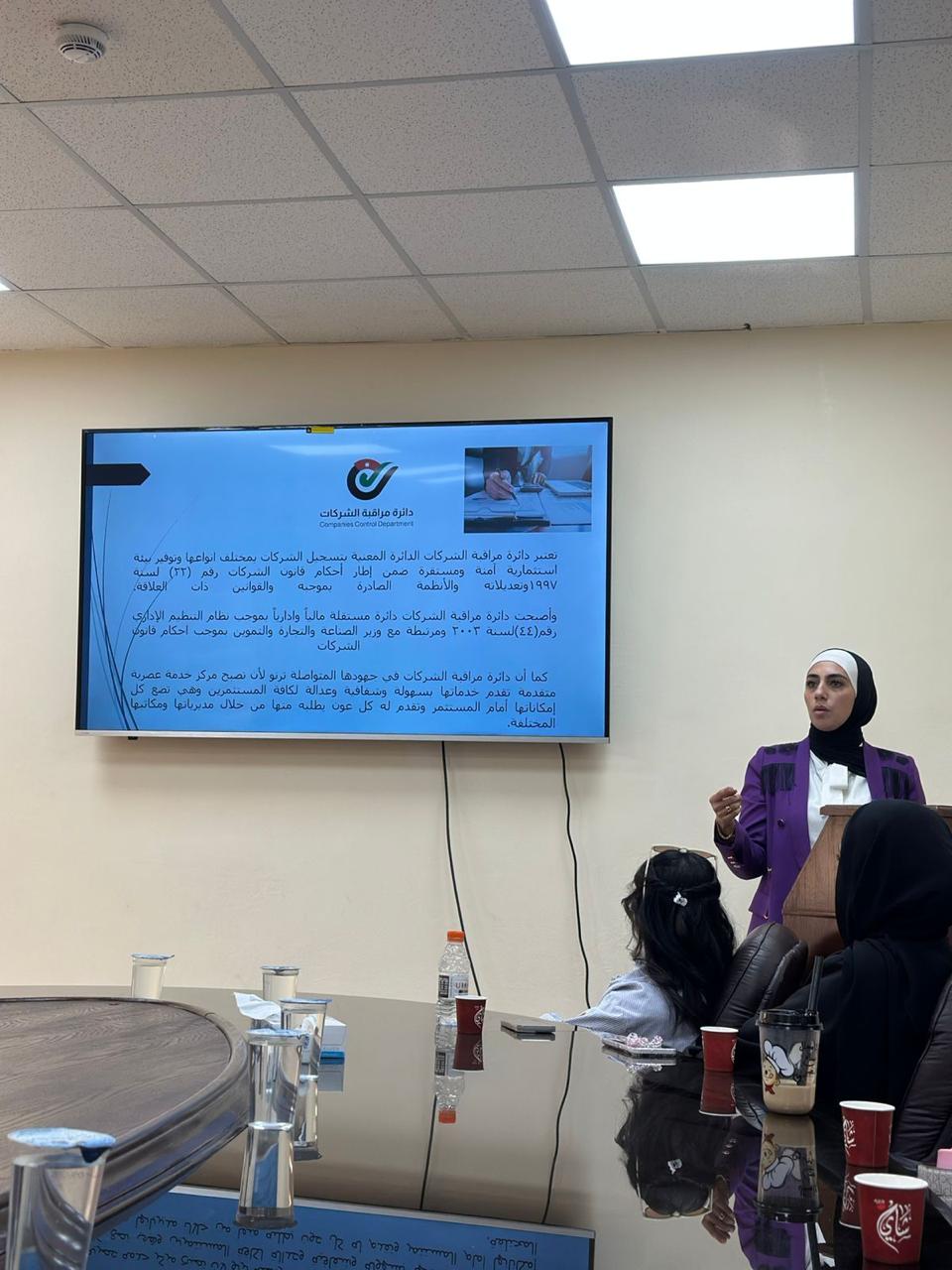 في ضوء خطة الدائرة للمسؤولية المجتمعية استقبلت دائرة مراقبة الشركات مجموعة من طلبة الجامعة الهاشمية في زيارة ميدانية تهدف الى تعريفهم بمهام الدائرة وإجراءاتها في تسجيل وتنظيم ومتابعة اعمال الشركات.